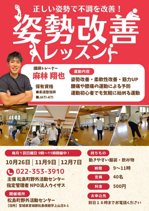 10月から柔道整復師を持つ麻林翔也トレーナーを迎えて姿勢改善レッスンを行います。